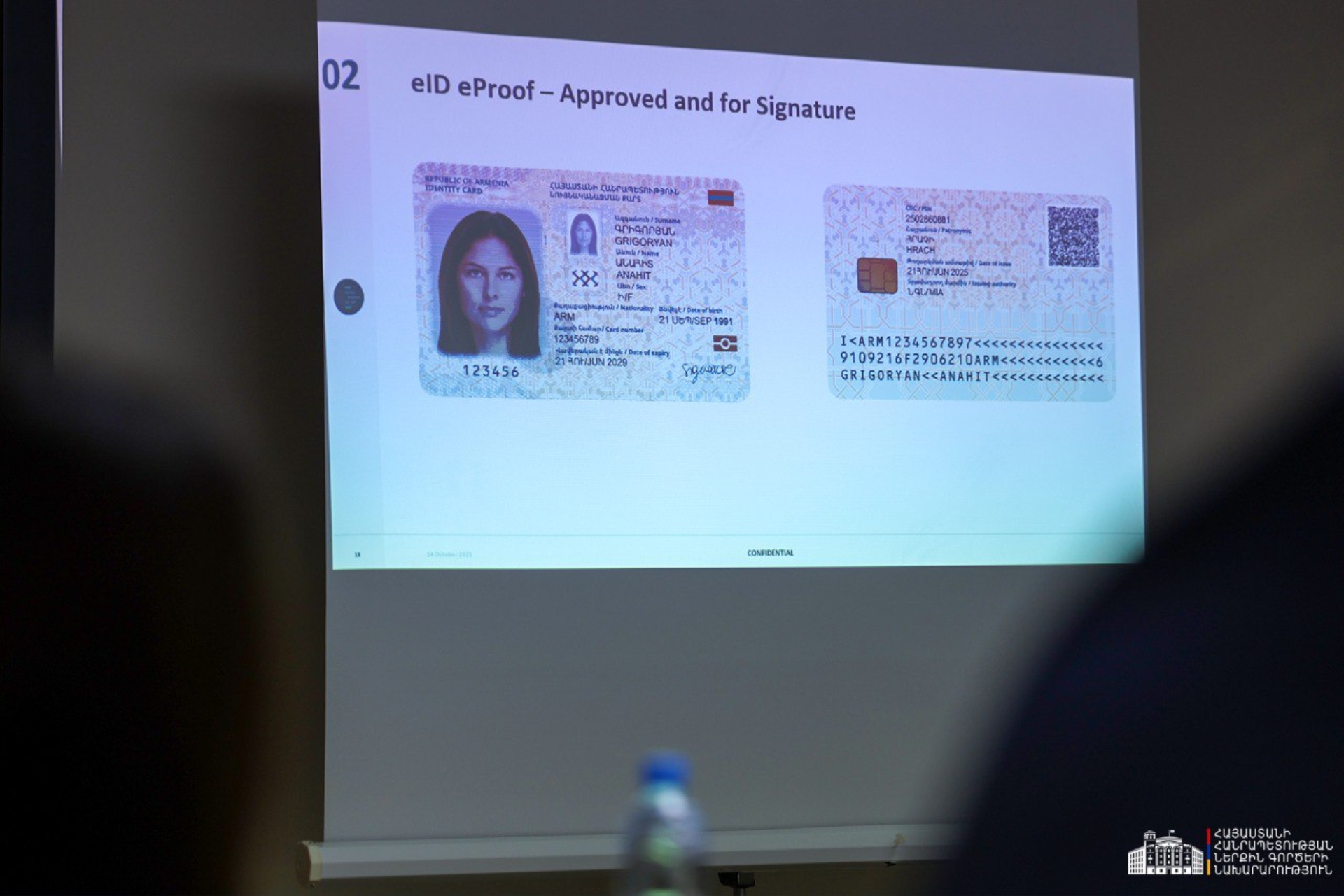 Նախարար Արփինե Սարգսյանը հաստատել է նույնականացման քարտի վերջնական տեսքը՝ ներառյալ ֆոնային գեղարվեստական լուծումները, անվտանգային բաղադրիչները և տվյալների դաշտերը։ Ողջ աշխատանքը կատարվել է համապատասխան ICAO ստանդարտով։