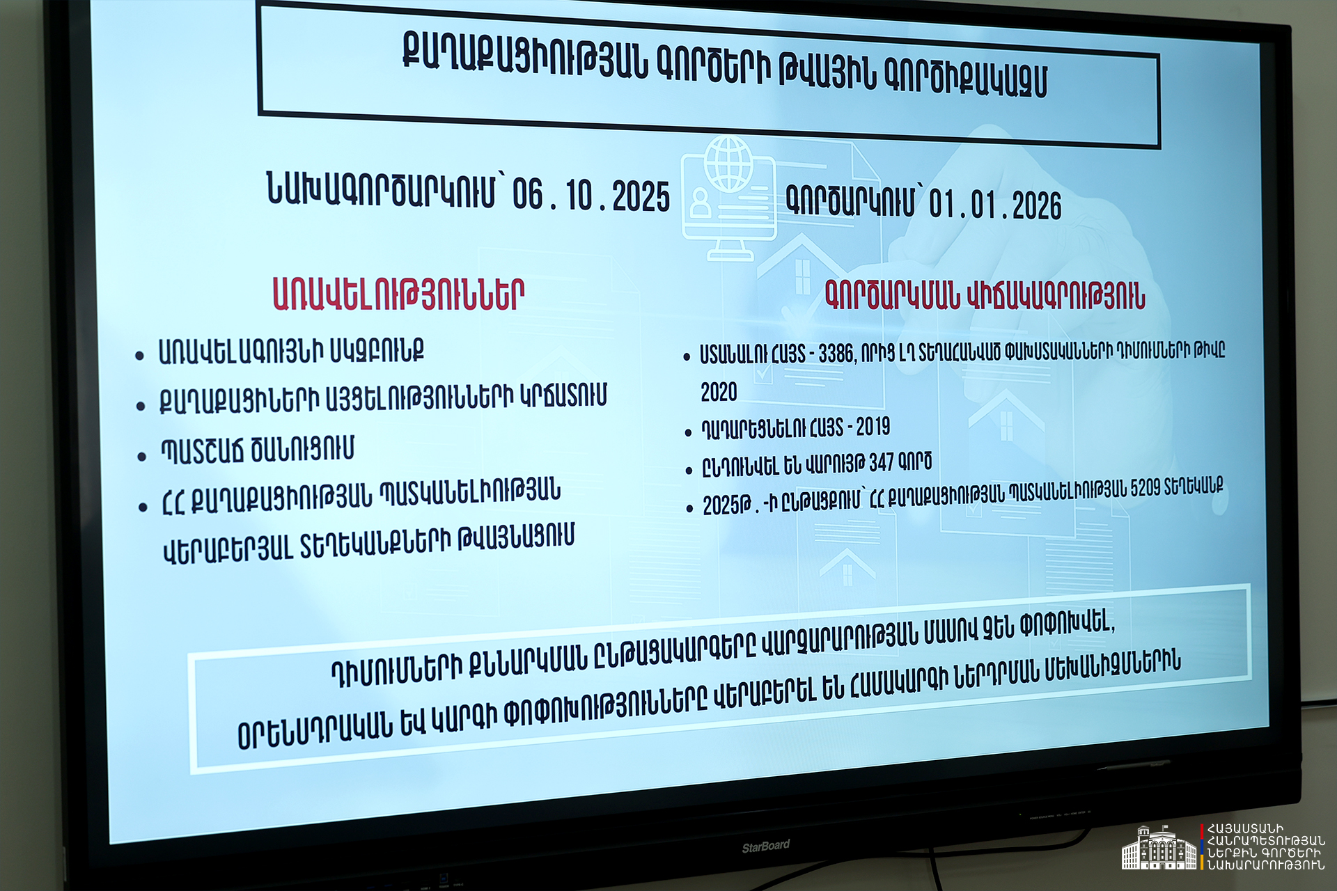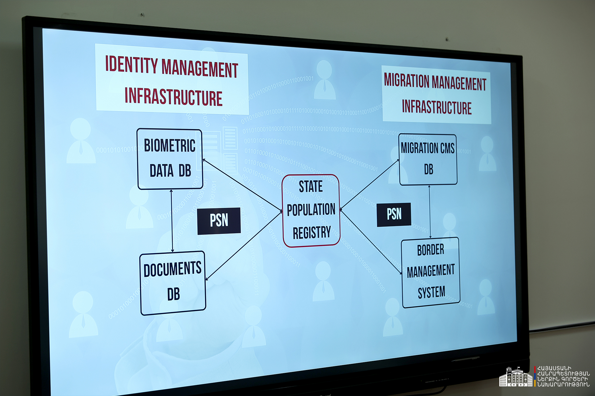 Քննարկվել է բնակչության պետական ռեգիստրի, կենսաչափական նոր համակարգի, տվյալների շտեմարանի, փաստաթղթերի բազայի, միգրացիոն գործերի կառավարման համակարգերի միասնական ենթակառուցվածքի ձևավորման և քաղաքացիության դիմումների էլեկտրոնային կառավարման մեխանիզմներին վերաբերող հարցեր:
