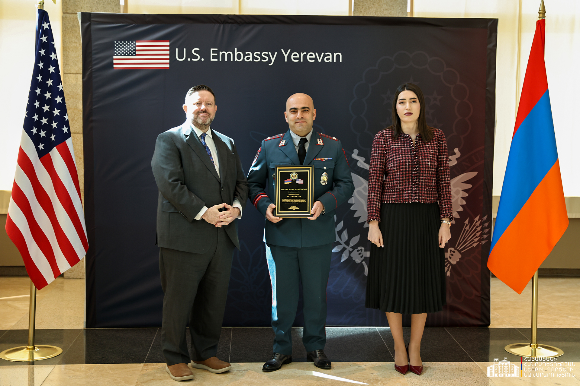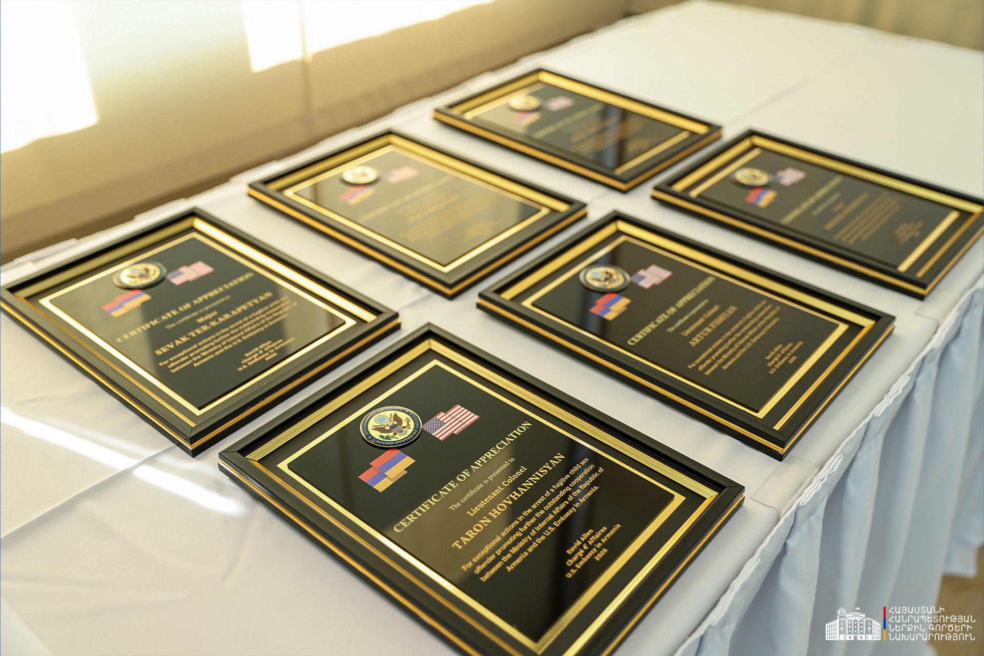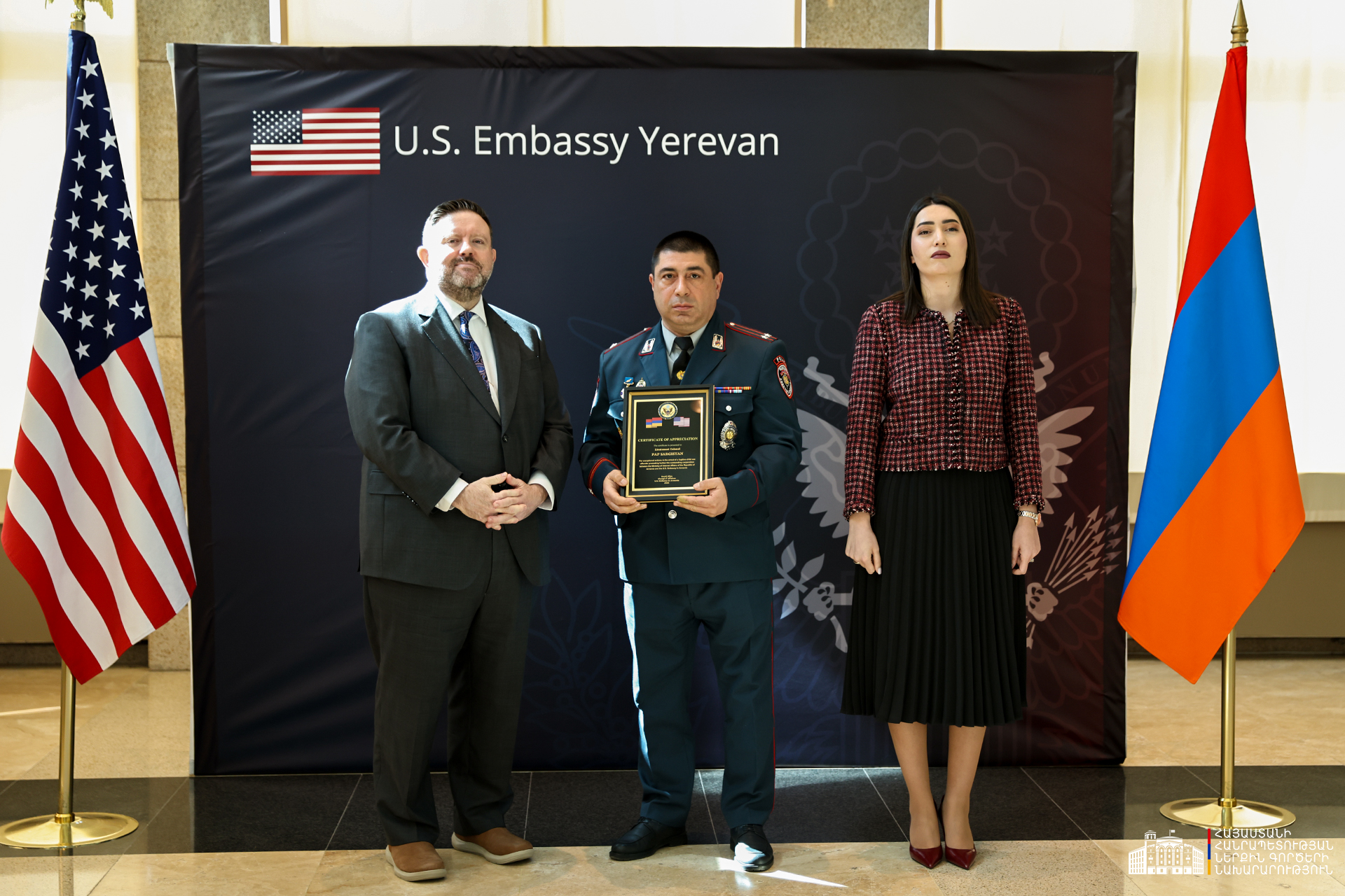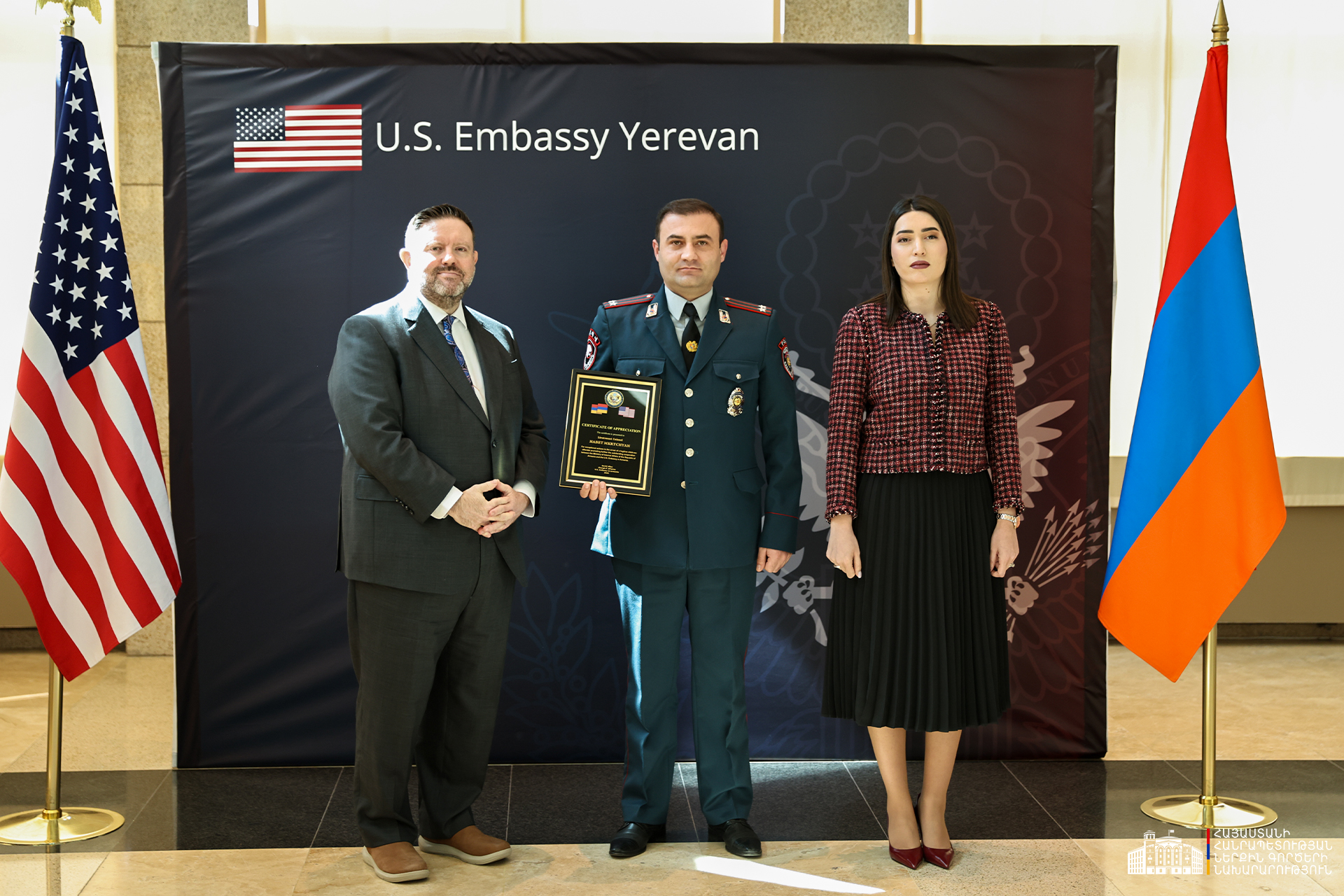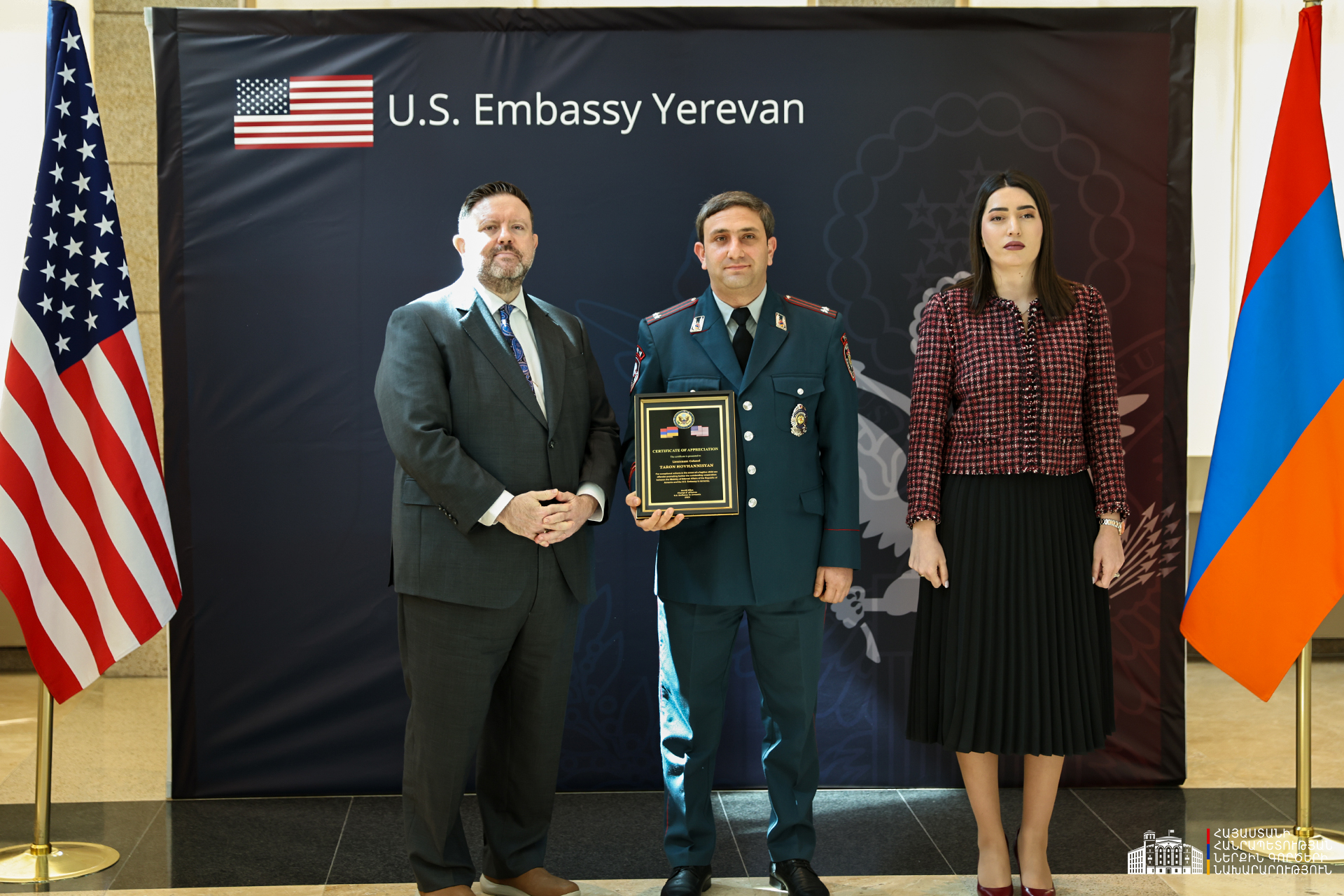ՆԳ նախարարության և ՀՀ-ում ԱՄՆ դեսպանատան միջև արդյունավետ համագործակցության և բացառիկ գործողությունների համար մի խումբ ծառայողների հանձնվել են շնորհակալագրեր։